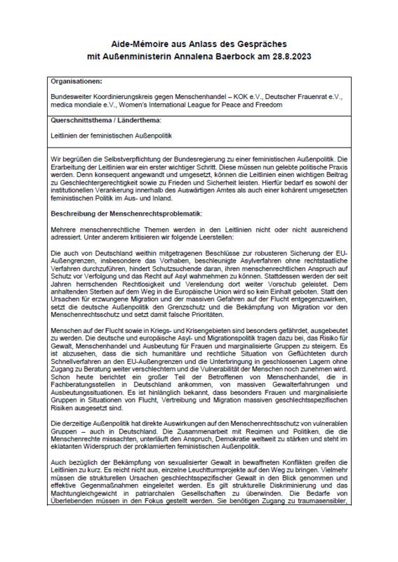 Aus Anlass des Gespräches mit Außenministerin Annalena Baerbock am 28.8.2023 hat der KOK e.V. gemeinsam mit dem Deutschen Frauenrat e.V., medica mondiale e.V. und Women’s International League for Peace and Freedom ein Aide-Mémoire zur feministischen Außenpolitik erarbeitet. Es wird darin begrüßt, dass sich die Bundesregierung durch die Erarbeitung von Leitlinien zu einer feministischen Außenpolitik verpflichtet, die in gelebter Praxis und konsequenter Anwendung einen wichtigen Beitrag zu Geschlechtergerechtigkeit sowie zu Frieden und Sicherheit leisten kann. Allerdings werden mehrere Leerstellen kritisiert und die Berücksichtigung weiterer menschenrechtlicher Themen gefordert.