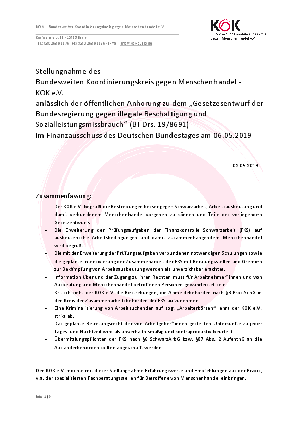 Anlässlich der Anhörung des Finanzausschusses des Bundestags zu dem Gesetzentwurf der Bundesregierung „Entwurf eines Gesetzes gegen illegale Beschäftigung und Sozialleistungsmissbrauch“ am 06. Mai 2019, veröffentlicht der KOK e.V. eine aktualisierte Stellungnahme. Eva Küblbeck wird den KOK e.V. bei der Anhörung als Sachverständige vertreten und insbesondere zur Kompetenzerweiterung der Finanzkontrolle Schwarzarbeit (FKS) sowie den Rechten der Betroffenen von Arbeitsausbeutung Stellung beziehen.