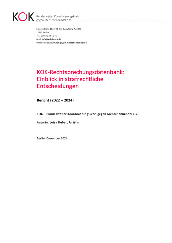 Der KOK veröffentlicht den aktuellen Bericht der Rechtsprechungsdatenbank für den Zeitraum 2022–2024. Die Vorschriften der für Menschenhandel und Ausbeutung relevanten §§ 232 ff. Strafgesetzbuch (StGB) sowie §§ 180a, 181a StGB wurden zuletzt 2016 umfassend reformiert. Schon früh gab es Kritik an den Gesetzesänderungen und ihrer Wirksamkeit, die bis heute anhält.