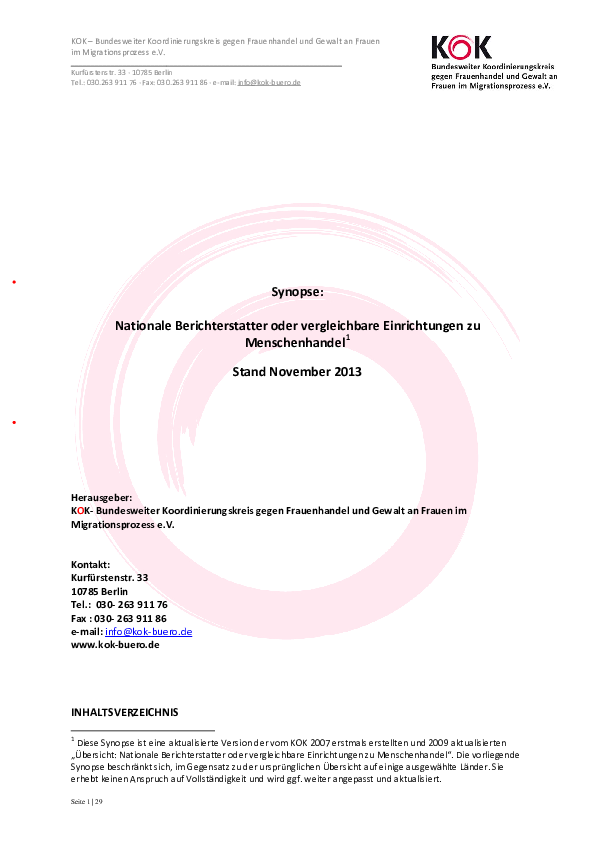 Der KOK hat seine bereits 2007 erstmals erstellte und 2009 aktualisierte Übersicht zu Berichterstattungsstellen zu Menschenhandel oder vergleichbaren Mechanismen Ende 2013 erneut aktualisiert. Die aktualisierte Version beschreibt einige ausgewählte Länderbeispiele, in denen eine aktive Berichterstattungsstelle oder ein vergleichbarer Mechanismus existiert.