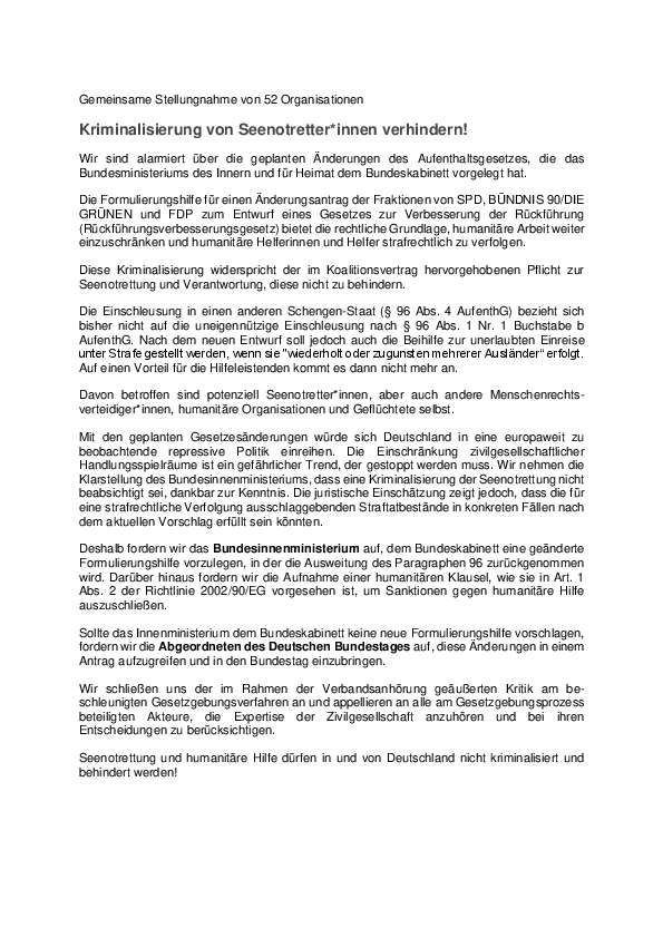 Deshalb fordern wir das Bundesinnenministerium auf, dem Bundeskabinett eine geänderte Formulierungshilfe vorzulegen, in der die Ausweitung des Paragraphen 96 zurückgenommen wird. Darüber hinaus fordern wir die Aufnahme einer humanitären Klausel, wie sie in Art. 1 Abs. 2 der Richtlinie 2002/90/EG vorgesehen ist, um Sanktionen gegen humanitäre Hilfe auszuschließen.