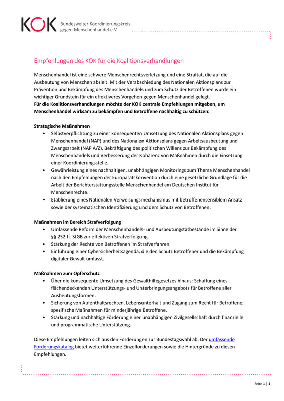 Für die Koalitionsverhandlungen möchte der KOK zentrale Empfehlungen mitgeben, um Menschenhandel wirksam zu bekämpfen und Betroffene nachhaltig zu schützen.