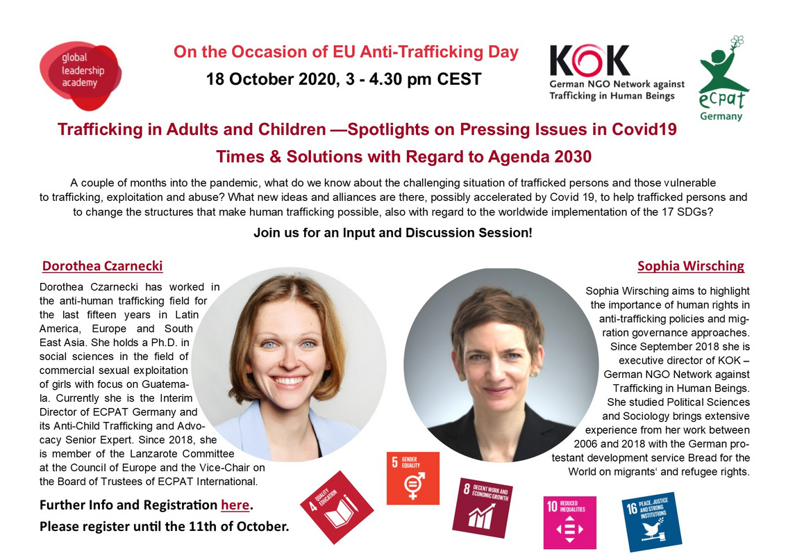 Zum jährlichen europäischen Tag gegen Menschenhandel wird unsere KOK Geschäftsführerin Sophia Wirsching in diesem Jahr mit Dr. Dorothea Czarnecki, kommissarsische Geschäftsführerin von ECPAT e.V. in einem virtuellen Rahmen ein Expert*innen Gespräch zum Thema Handel mit Erwachsenen und MInderjährigen führen. Der Fokus wird dabei inbesondere auf die dringenden Herausforderungen durch die COVID-19 Pandemie auf Betroffene von Menschenhandel gelegt. Ein Bezug zur Agenda 2030 für nachhaltige Entwicklung wird dabei ebenfallsin Betracht gezogen.