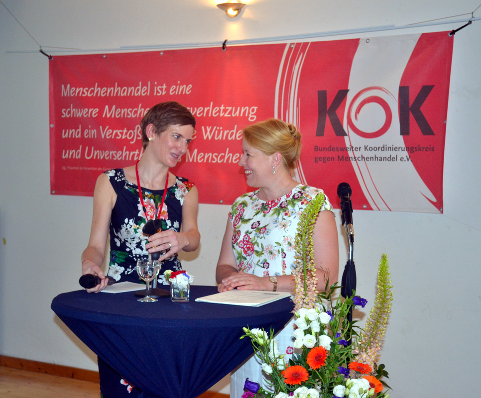 Dr. Franziska Giffey, Bundesministerin für Familie, Senioren, Frauen und Jugend (BMFSFJ), überbrachte ihr Grußwort persönlich und bestärkte den KOK und seine Mitgliedsorganisationen in ihrer Arbeit. Eva Schaab, die zum Gründungsvorstand des KOK gehörte, ließ die Geschichte des KOK Revue passieren. Einen Einblick in die aktuellen Herausforderungen im Engagement gegen Menschenhandel gab Margarete Mureșan, ebenfalls ehemaliges Vorstandsmitglied und Mitarbeiterin der Mitgliedsorganisation IN VIA Berlin.