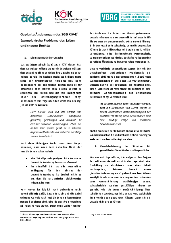 Der KOK e.V., der Arbeitskreis der Opferhilfen (ado) und der Verband der Beratungsstellen für Betroffene rechter, rassistischer und antisemitischer Gewalt (VBRG) haben eine Kurzfassung veröffentlicht, um die zentralen Punkte aus der ausführlichen Stellungnahme zu den geplanten Änderungen des Sozialen Entschädigungsrechts zusammenzufassen. Die Zusammenfassung bezieht sich auf den Gesetzesentwurf vom 20.11.2018. Autorin der Zusammenfassung ist Katrin Kirstein.