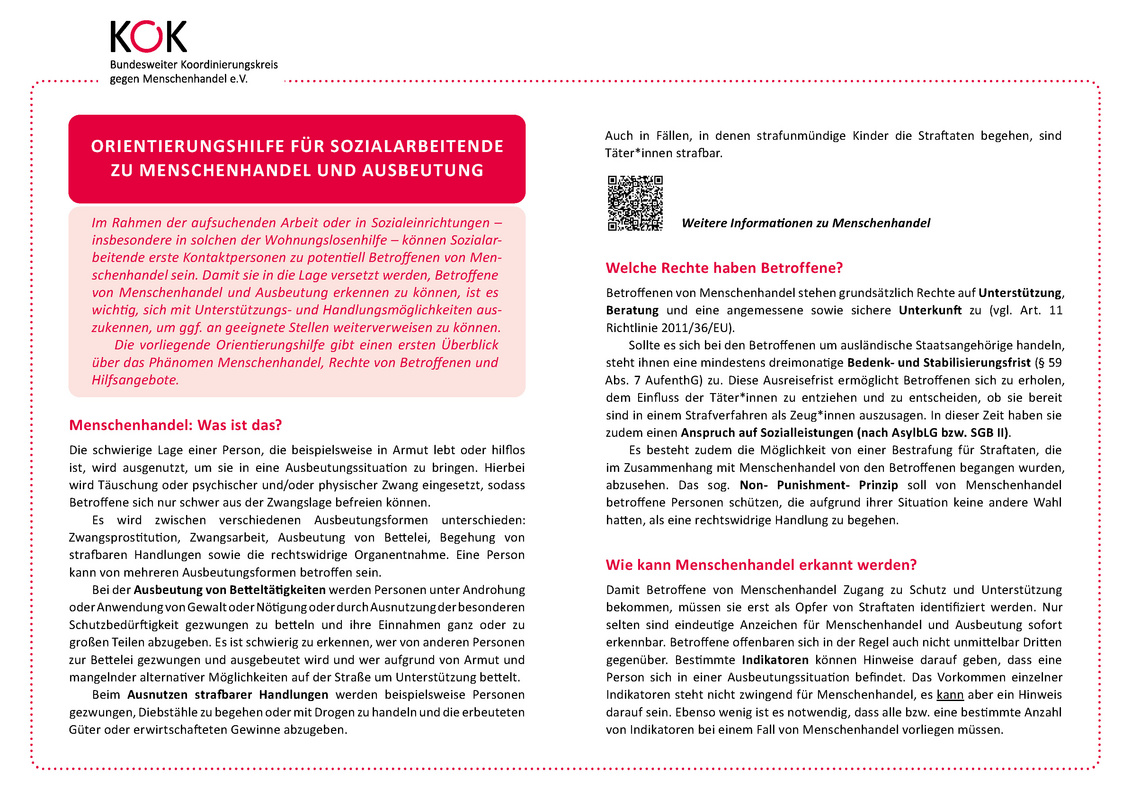 Im Rahmen der aufsuchenden Arbeit oder in sozialen Einrichtungen können Sozialarbeitende in Kontakt mit Betroffenen von Menschenhandel und Ausbeutung kommen. Sie können so zentrale Akteure bei der Identifizierung Betroffener sein. Die neue KOK-Orientierungshilfe soll Praktiker*innen, insbesondere Sozialarbeitende in der Wohnungslosenhilfe, in diesen Fällen konkrete Informationen an die Hand geben, was Menschenhandel ist, welche Rechte Betroffene haben und welche Unterstützungsmöglichkeiten es gibt.
