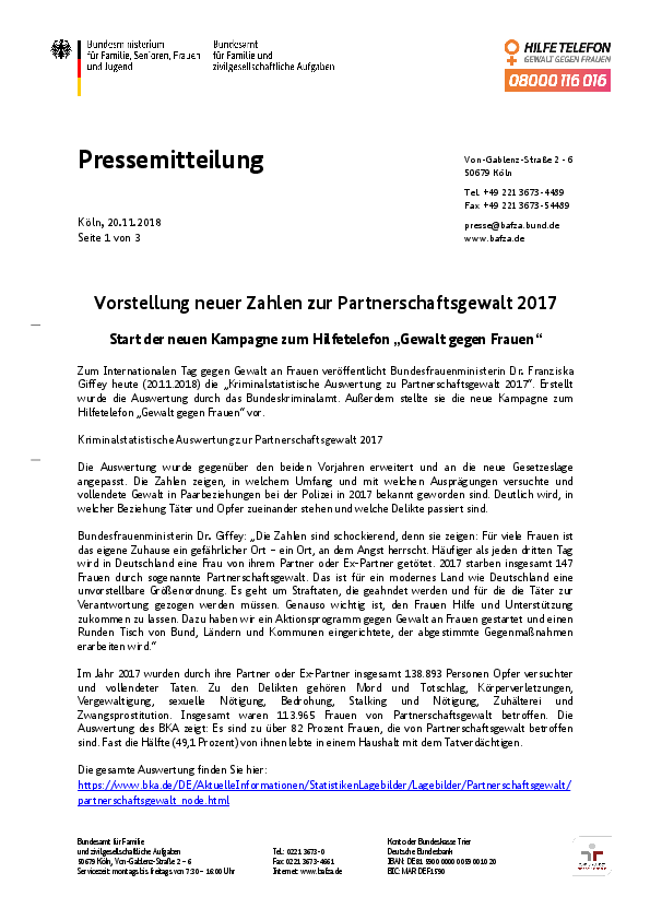 Die Kriminalstatistische Auswertung zu Partnerschaftsgewalt hat ergeben, dass 2017 138 893 Personen Opfer versuchter oder vollendeter Taten durch Partner oder Ex-Partner geworden sind. Dazu gehören Mord und Totschlag, Körperverletzung, Vergewaltigung, sexuelle Nötigung, Bedrohung, Stalking und Nötigung, sowie Zuhälterei und Zwangsprostitution. Über 82 Prozent der betroffenen Personen sind Frauen und fast die Hälfte (49,1 %) lebte gemeinsam mit dem Tatverdächtigen in einem Haushalt. 147 Frauen sind 2017 durch Partnerschaftsgewalt gestorben.