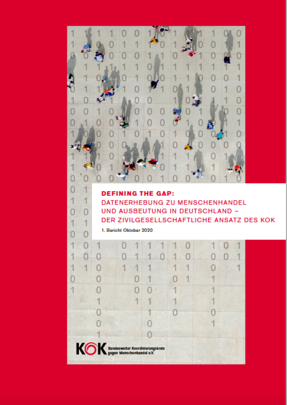 Bereits seit 2012 befasst sich der KOK e.V. intensiv mit den Themen Datenerhebung zu und Datenschutz für Betroffene von Menschenhandel. Vor dem Hintergrund internationaler Empfehlungen sowie dem Anliegen, die zivilgesellschaftliche Arbeit mit Betroffenen von Menschenhandel zu dokumentieren als auch mit dem Anspruch, die Wahrung ihrer Rechte zu stärken, entwickelte der KOK e.V. ein Tool zur Erhebung von Daten zu Menschenhandelsfällen seiner Mitgliedsorganisationen. Ziel ist die Bewertung der Maßnahmen gegen Menschenhandel und zum Schutz der Betroffenen aus menschenrechtlicher Perspektive. Die damit einhergehenden Herausforderungen und zivilgesellschaftlichen Blickwinkel werden in dem Bericht Defining the Gap: Datenerhebung zu Menschenhandel und Ausbeutung in Deutschland - der zivilgesellschaftliche Ansatz des KOK vorgestellt.