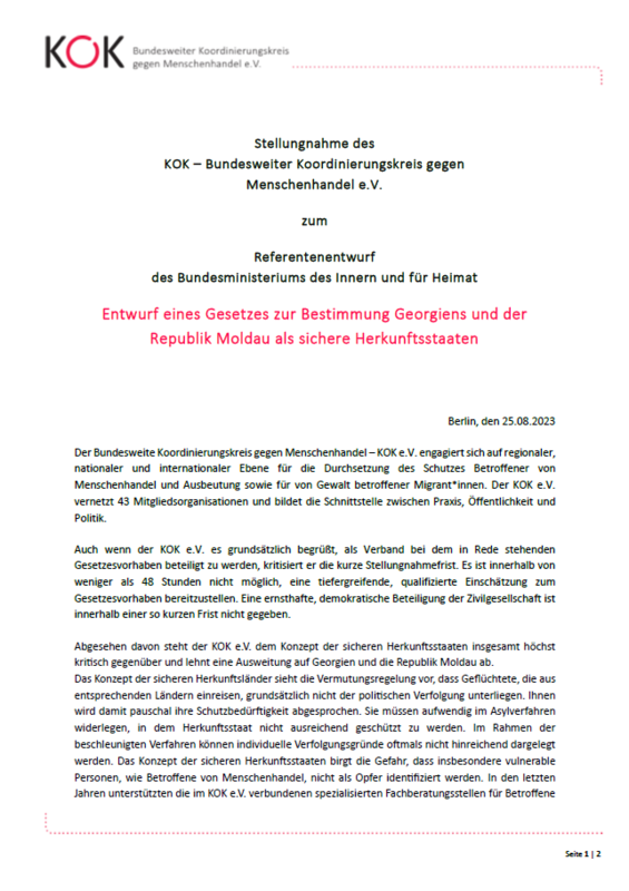 Der KOK e.V. kritisiert in erster Linie, dass die Frist zur Stellungnahme deutlich zu kurz ist, um eine tiefgreifende, qualifizierte Einschätzung des Gesetzesvorhabens bereitzustellen und eine ernsthafte zivilgesellschaftliche Beteiligung zu gewährleisten. Abgesehen davon lehnt der KOK e.V. das Konzept der sicheren Herkunftsstaaten grundsätzlich ab, da Schutzsuchenden aus entsprechenden Ländern durch die Vermutungsregelung pauschal ihre Schutzbedürftigkeit abgesprochen wird. Dadurch können Verfolgungsgründe im Rahmen der beschleunigten Verfahren oftmals nicht hinreichend dargelegt werden. Es besteht die Gefahr, dass insbesondere vulnerable Gruppen, wie Betroffene von Menschenhandel, nicht identifiziert und damit unzureichend unterstützt und geschützt werden.