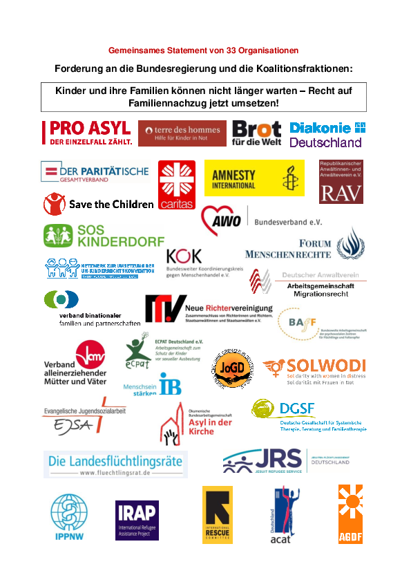 Bereits im letzten Jahr forderte ein breites Bündnis zum Weltkindertag am 20. September die Bundesregierung auf, das Recht auf Familienzusammenführung, wie im Koalitionsvertrag angekündigt, endlich umzusetzen. Diese Aufforderung wurde nun erneuert.